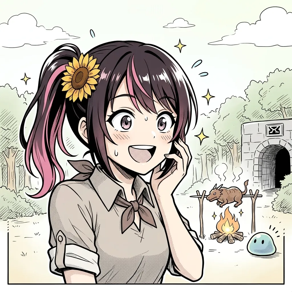 フェル、ドラちゃん、スイちゃんはダンジョンへ行く気満々で、ムコーダさんだけがいつものように振り回されている。この構図、何度見ても安心するね。魔法のオーブンを用意したり、牛丼や肉料理を仕込んだり、危険な冒険の前なのに準備が完全に食いしん坊仕様なのが好き。戦いよりごはんの段取りが大事、というムコーダさんらしさがよく出ていた。